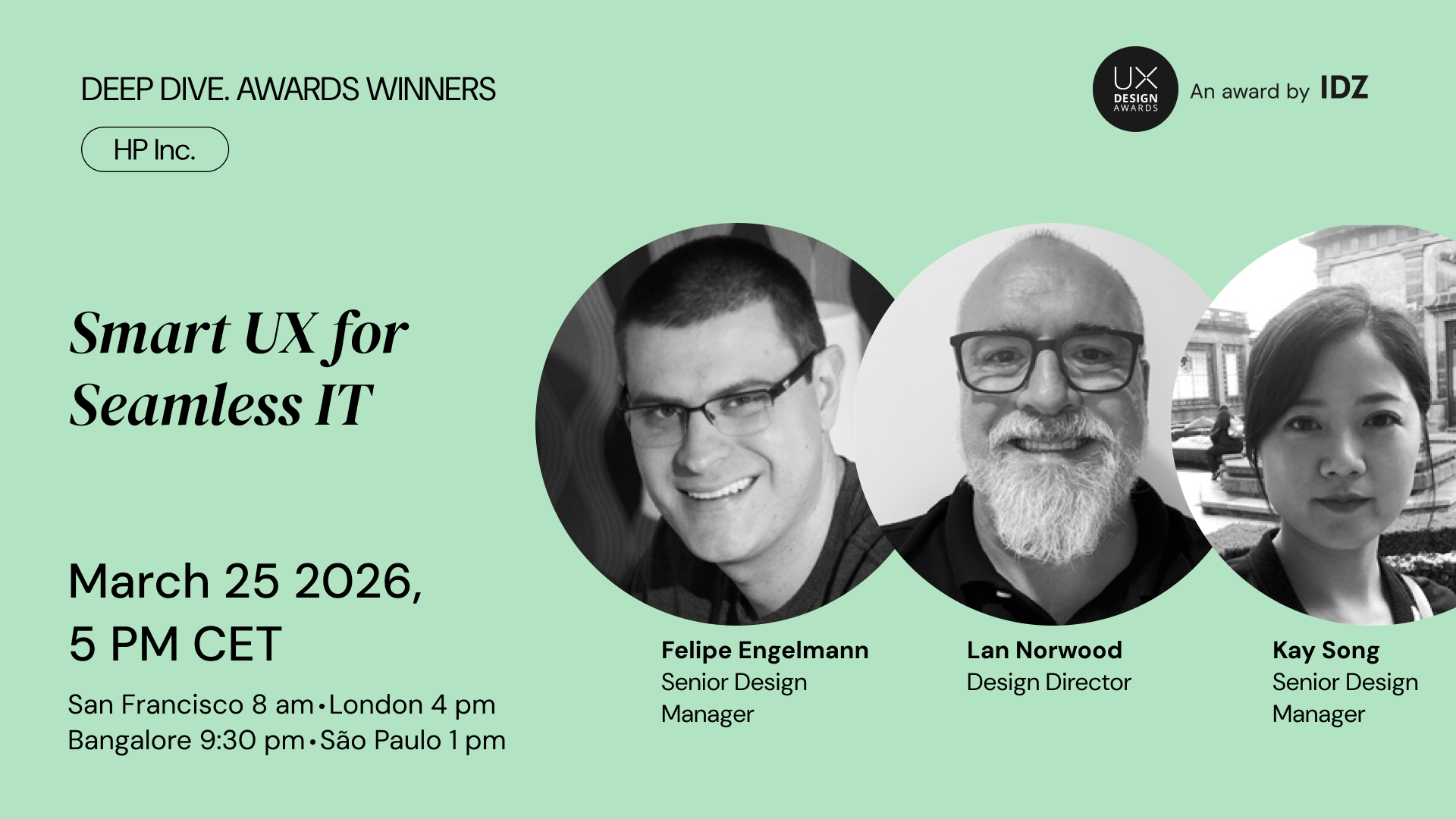 Join us for a Deep Dive on Wed. March 25 at 5PM (CET) with Lan Norwood, Kay Song, and Felipe Engelmann from HP Inc., as we learn more about HP Workforce Experience Platform , one of the winners of the UX Design Awards 2025!
