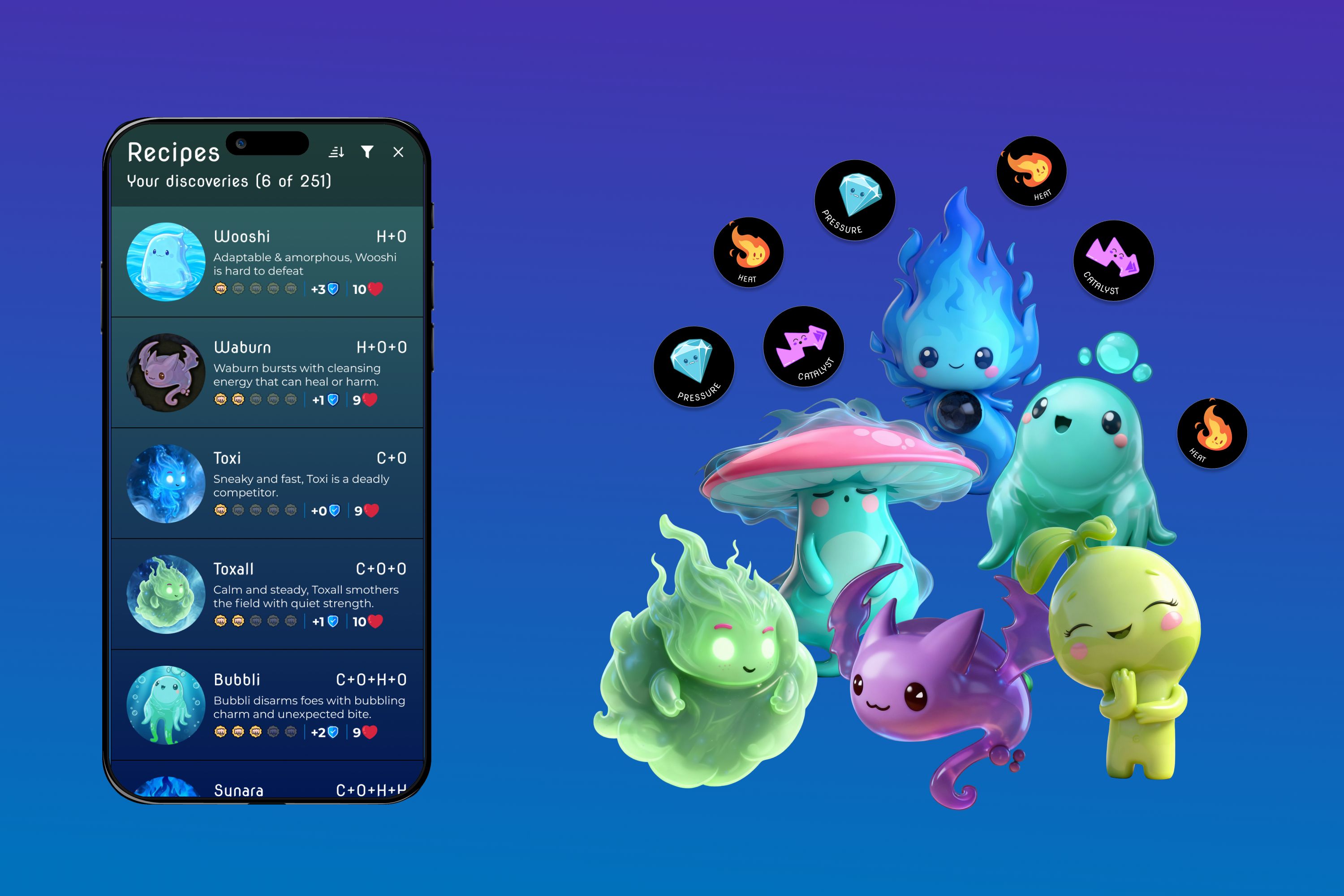 We set out to create an educational game that doesn’t feel educational, something simple to learn, fun to play, and deep enough for long-term engagement. We knew we needed to simplify the complexity of chemistry, so we focused on two core learning goals: molecules have unique properties, and when molecules interact, they create reactions. These goals defined where to stay true to science and where to gamify. Molecules become imaginative characters inspired by their chemical properties. Battles mirror real chemical reactions, showing factors that influence reactions, common reaction types, and signs of chemical change. Players absorb these concepts naturally as they discover characters, learn their abilities, and develop strategic matchups.