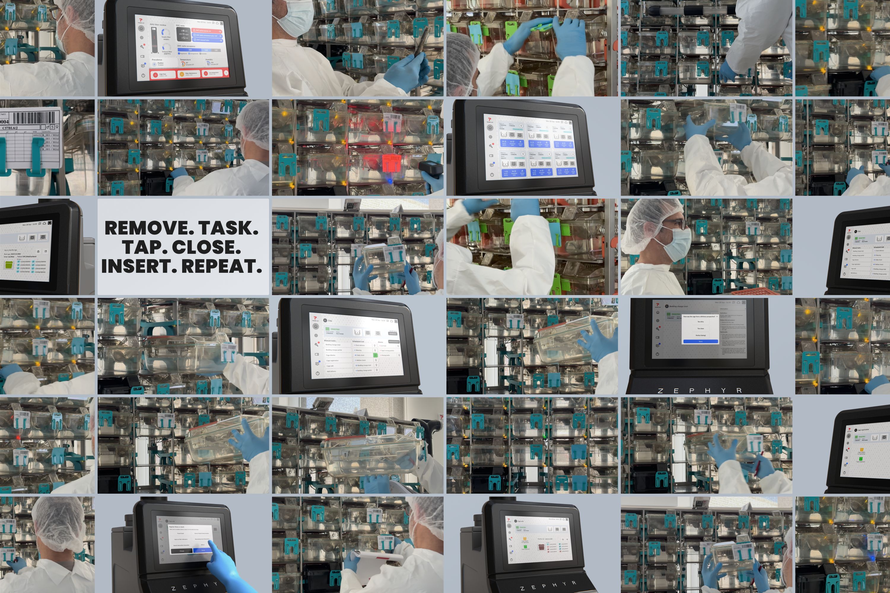 Having designed for contamination-controlled environments, I knew bringing a PC into a sterile area is a major constraint. From the start, I assumed PC use for ACTs should be minimal, not an easy task when you manage the workflows of 500 cages. While working on Top Holder's UI, a developer asked: “If the display is still 7'', how are you fitting more content? It feels like your UI has twice the space.” We realized that was precisely the constraint we had missed. The intuition was confirmed in Groningen: an operator was collecting cages' tags to speed up data entry. That defined Zephyr's vision: a phygital experience merging GUI and TUI. It challenged the team, but paid off: Zephyr was showcased at AALAS in November.